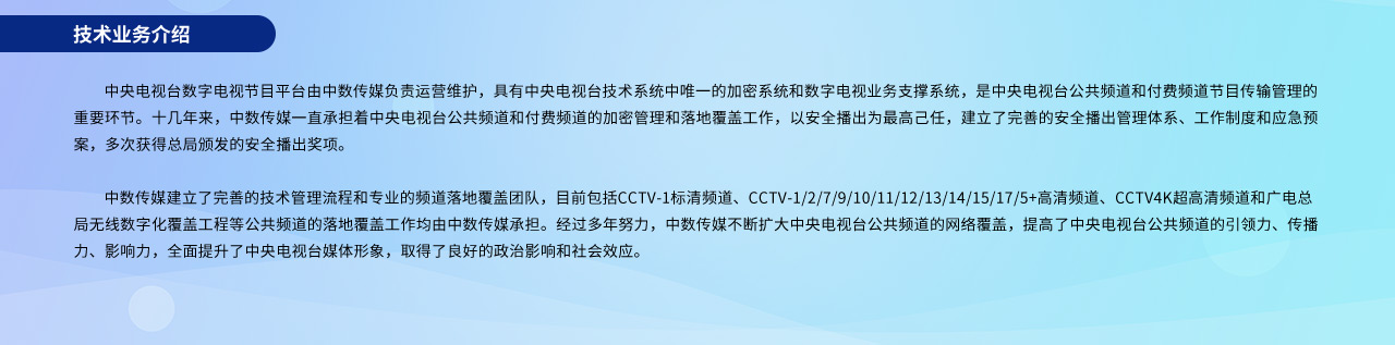 中央數字電視傳媒有限公司(簡稱“中數傳媒”),成立于2003年10月,是中央廣播電視總臺旗下覆蓋全國范圍、多渠道、多終端的付費電視頻道集成及全媒體運營平臺。
